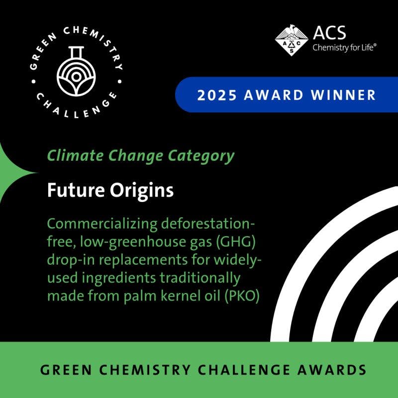 SAN DIEGO, Aug. 25, 2025 /PRNewswire/ -- Future Origins has been named a winner of the of the 2025 Green Chemistry Challenge Award by the American Chemical Society (ACS) for Nalo, its non-palm, zero-deforestation, drop-in replacement for C12/C14 fatty alcohols. The ACS awards focus on innovators in sustainable chemistry and "scientific breakthroughs that make chemistry safer, more efficient and more sustainable." The recognition for Future Origins is in the category of Specific Environmental Benefit as it is commercializing sustainable alternatives to critical ingredients in the formulations of cosmetics, personal care and cleaning products.